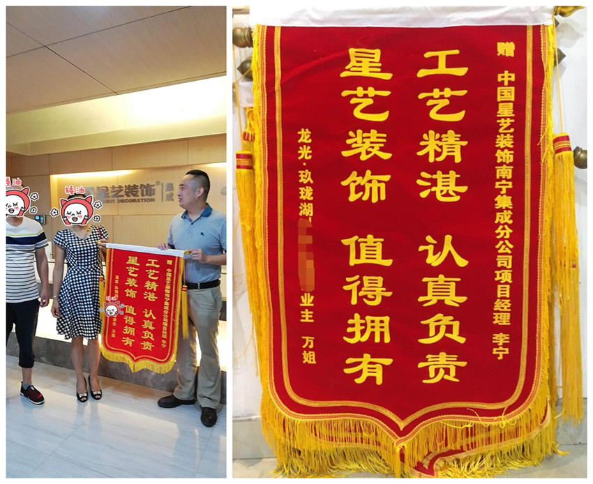 2018年9.月9日,龍光玖瓏湖業(yè)主送來錦旗,稱贊星藝裝飾項(xiàng)目經(jīng)理李寧,工藝精湛,認(rèn)真負(fù)責(zé),星藝裝飾,值得擁有