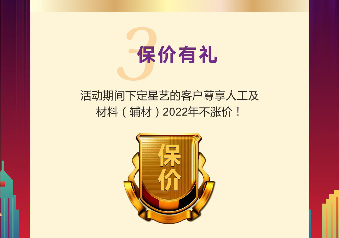 環(huán)保、運輸、限電政策嚴格管控下,材料上漲、人工上漲導(dǎo)致裝修成本越來越高。為減少業(yè)主裝修煩腦,回饋廣大新老客戶,按集團總部統(tǒng)一部署,舉行2021年“歲未感恩.暖冬行動”全國跨年鉅惠大聯(lián)動活動,給八桂裝修業(yè)主帶來一場保質(zhì)更保價的高品質(zhì)家裝盛會。本次活動星藝特別承諾:活動期間下定,2022年裝修享2021年單價等以下多重好禮鉅惠,具體優(yōu)惠細則如下: