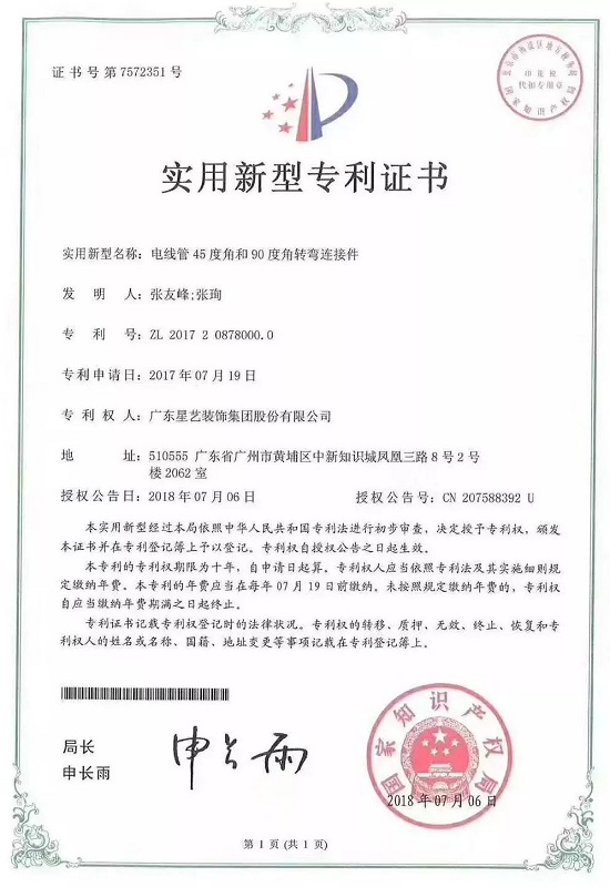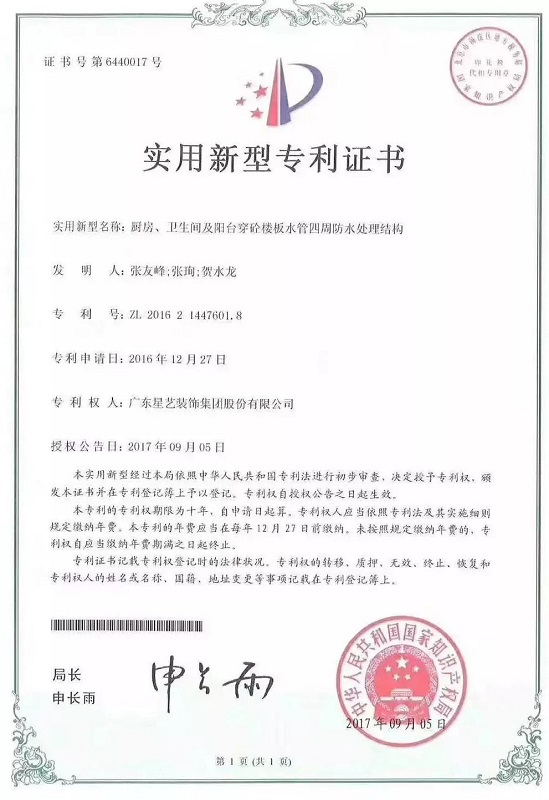答:星藝裝飾中國建筑裝修裝飾工程專業(yè)承包壹級企業(yè),同時也首創(chuàng)“裝修質(zhì)量錘宣言”--讓工地開口說話!而且星藝裝飾還研發(fā)出“窗臺大理石防水結(jié)構(gòu)”“波紋管連接件”“電線管45度角和90度角轉(zhuǎn)彎連接件”等近30項(xiàng)國家實(shí)用新型專利和外觀設(shè)計(jì)專利。這些工藝通過每位星藝人的不懈努力不斷研發(fā)環(huán)保創(chuàng)新型工藝至今已推出近30項(xiàng)自主研發(fā)改良的專利技術(shù),接下來展示部分專利: