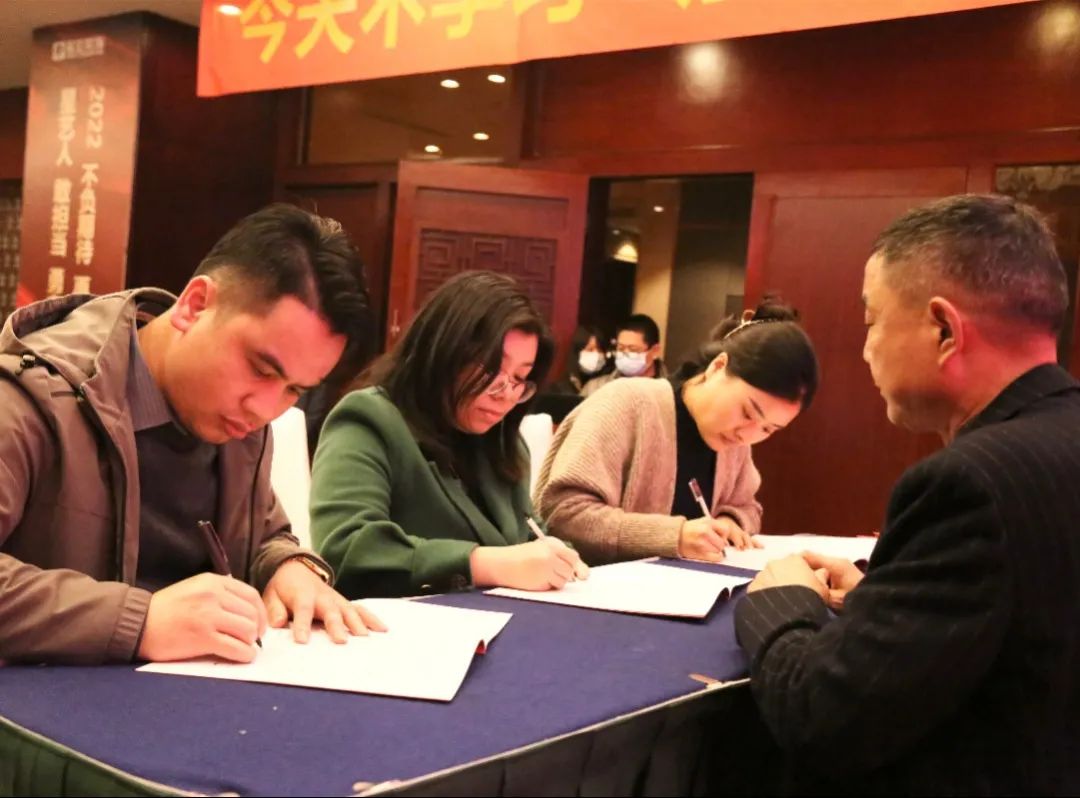在啟動前,由星藝裝飾南寧區(qū)域設(shè)計總監(jiān)李明上臺回顧分析2021年星藝南寧所取得的成績,在同比前年數(shù)據(jù)、上游市場的變化,李工表示“星藝南寧業(yè)績能保持穩(wěn)定增長的局面實屬不易”,并強調(diào)“不止團隊管理者要創(chuàng)新,部門也必須創(chuàng)新”,隨后與各個部門負責(zé)人簽訂年度目標(biāo)責(zé)任書、開年活動任務(wù)軍令狀。