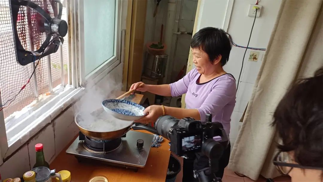 上午9時許,食堂內(nèi)就已經(jīng)很忙碌,各種備菜擺滿柜臺,10時50分前就要出餐。臨近中午,二樓以上的煙火味漸濃。走廊上,星藝家人趁著日光尚好,在護欄上曬白菜,即將腌酸做成美味;廚房里,一名星藝員工家屬正在炒菜,魚味辣香頗有老家江西味道;公寓拐角的休閑區(qū),身著工服的星藝人與剛學會走路的孩子逗趣,教“星二代”如何敬禮。