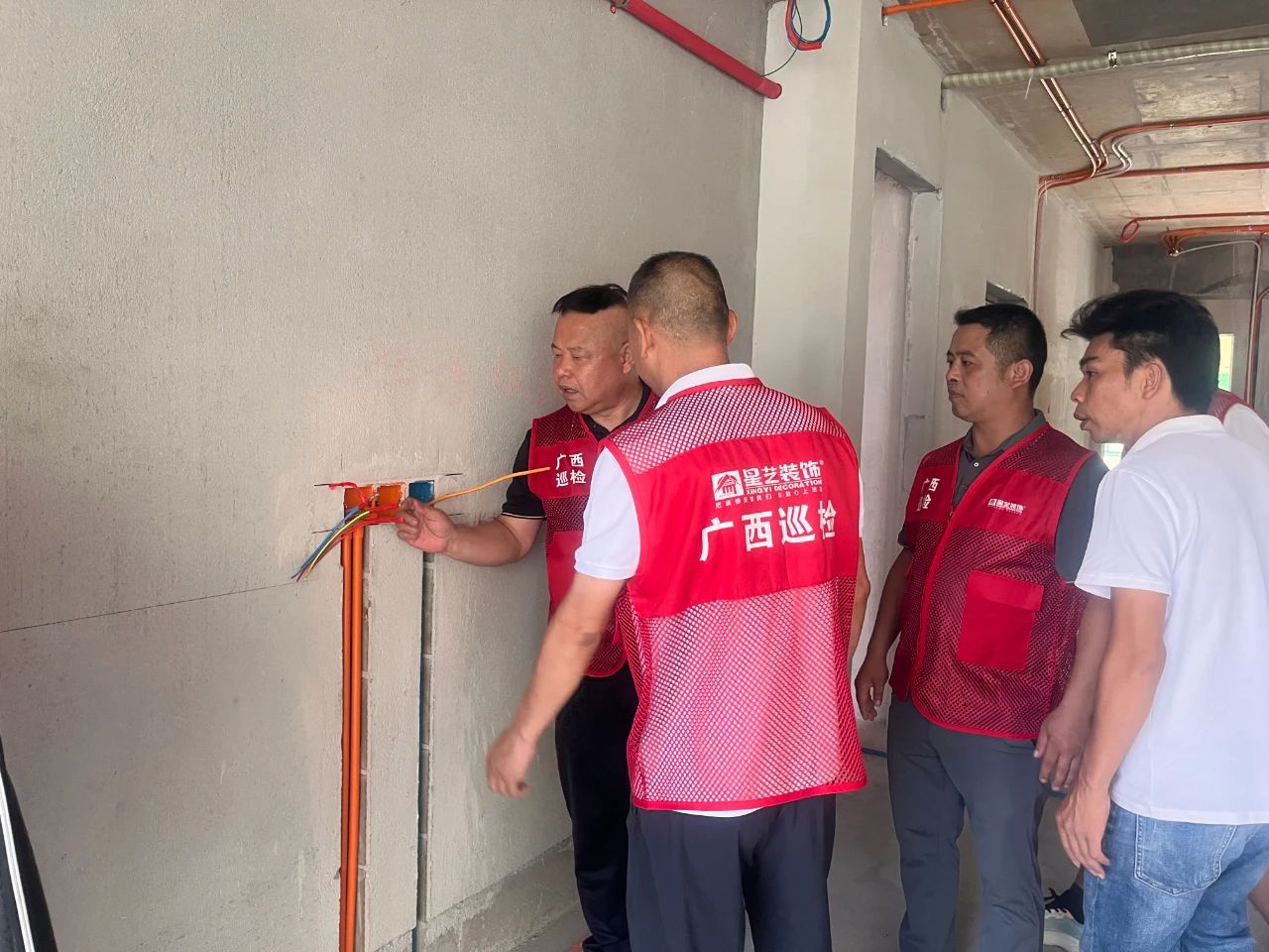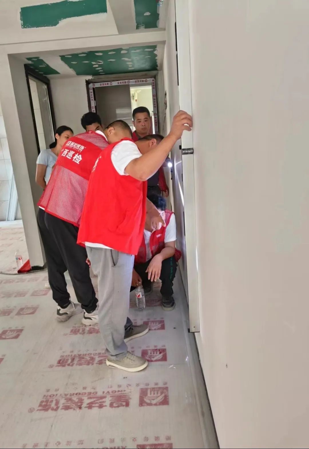 在檢查過程中,經(jīng)驗豐富的余工、吳工以及易經(jīng)理等一行人嚴格按照公司工程規(guī)范管理制度在工地上進行巡查,從墻面的平整度、用材的品質(zhì)到施工的工藝,幾位巡檢員現(xiàn)場溝通交流,上手檢查,連測帶量,精細到每一處細節(jié),力求保質(zhì)保量,為業(yè)主打造一個安全可靠的品質(zhì)新家。