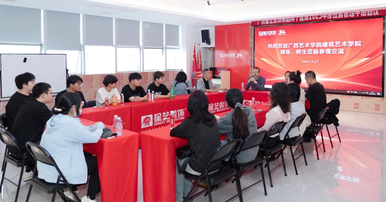 座談會上,李工代表星藝裝飾向?qū)W校師生一行人表示誠摯的歡迎,并與周云云經(jīng)理分別介紹了星藝裝飾創(chuàng)立34年、入邕23年以來的發(fā)展歷程、人才培養(yǎng)方式、校企合作理念以及與廣藝建院的星藝獎學(xué)金、廣藝在企優(yōu)秀學(xué)生代表的故事等;李工表示,星藝南寧在當(dāng)下新形勢和新模式發(fā)展中需要更多優(yōu)秀學(xué)生持續(xù)加入,并表達(dá)了期待能與廣西藝術(shù)學(xué)院建筑藝術(shù)學(xué)院在人才培養(yǎng)、產(chǎn)學(xué)融合等方面的深化交流合作,實現(xiàn)雙向賦能,為建筑裝飾行業(yè)培養(yǎng)更多的專業(yè)人才。