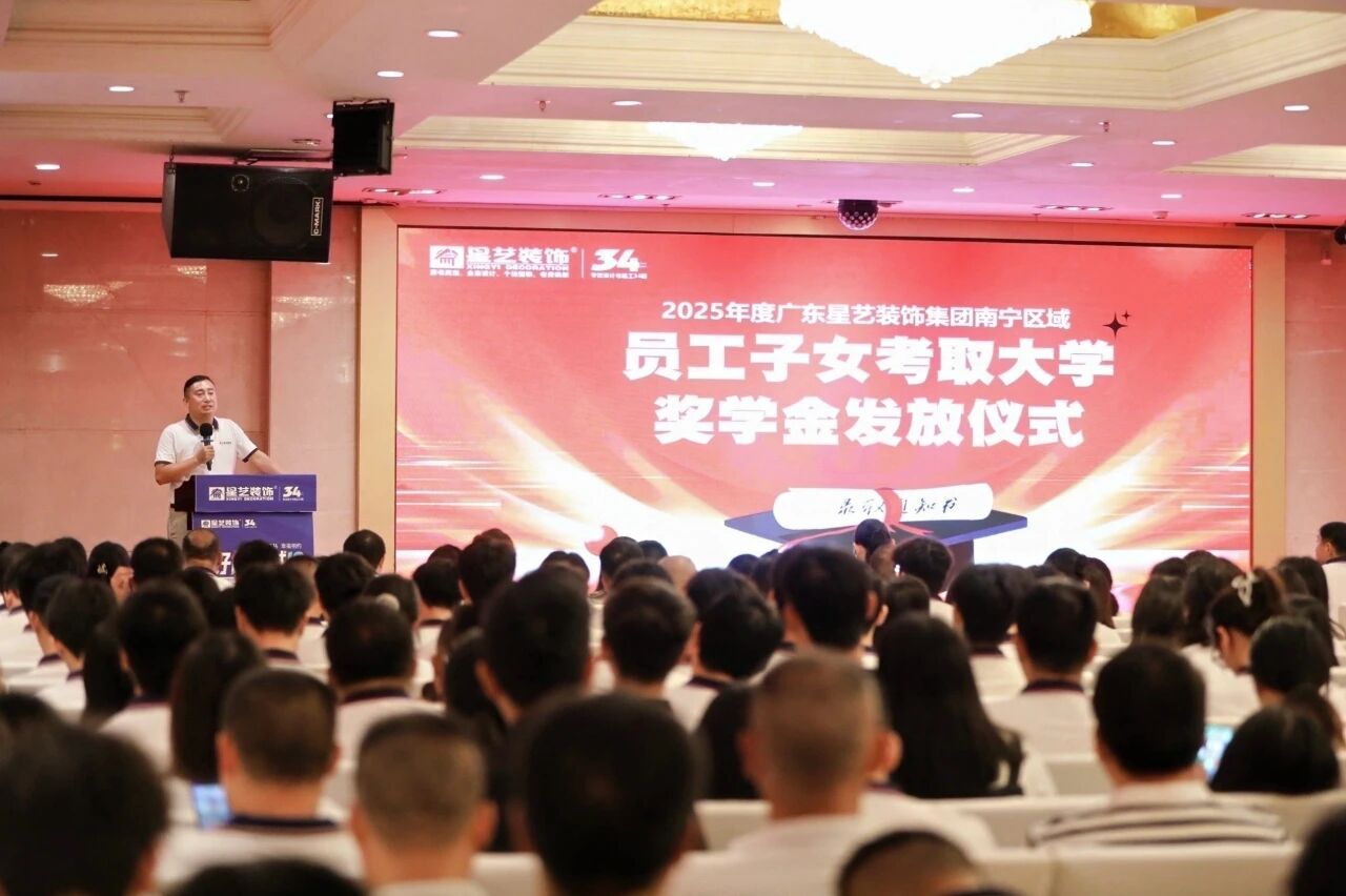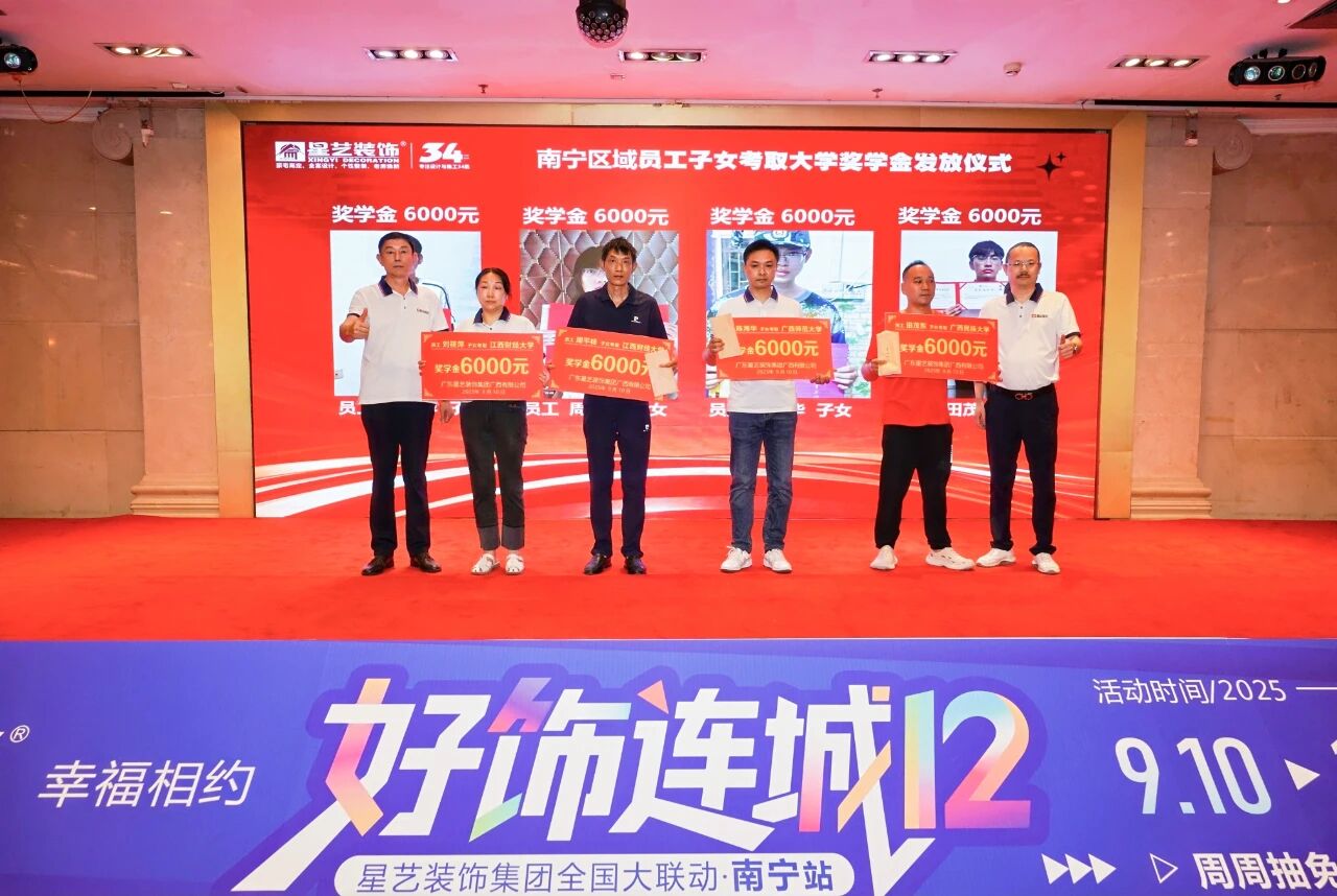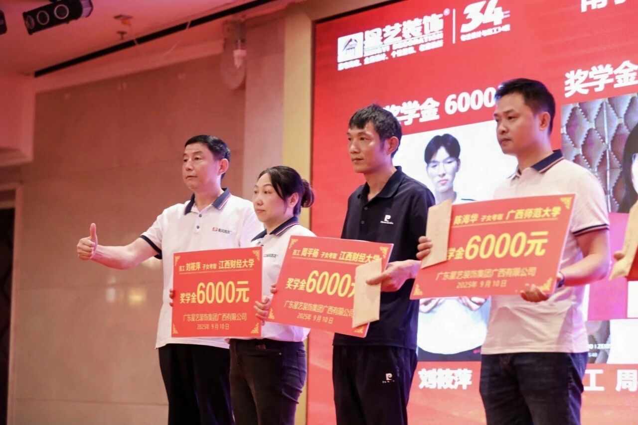 9月10日,2025年度星藝南寧區(qū)域員工子女大學(xué)獎(jiǎng)學(xué)金發(fā)放儀式在南寧金旺角國(guó)際酒店會(huì)議室溫情舉行,在四百多名星藝南寧家人的共同見(jiàn)證下,星藝南寧區(qū)域總經(jīng)理周平生、星藝南寧區(qū)域設(shè)計(jì)總監(jiān)李明為星藝員工劉筱萍、周平楊、陳海華、田茂東四位考上大學(xué)的“星二代”頒發(fā)星藝獎(jiǎng)學(xué)金,代表星藝裝飾關(guān)愛(ài)員工家庭,重視人才培養(yǎng),鼓勵(lì)“星二代”們奮發(fā)向上,努力學(xué)習(xí),在求學(xué)路上深耕精研,成為國(guó)家棟梁。